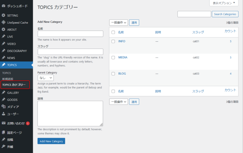 カテゴリー分けにも対応しており、予めカテゴリーを作成し、各投稿に適応することでカテゴリー毎に一覧表示することができます。
